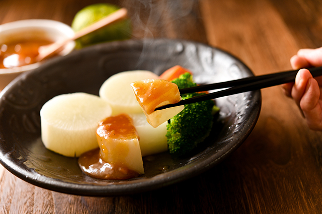 下ゆでと煮込みで冬大根をじっくりやわらかく仕上げ、箸がスッと通るほどのやさしい食感と甘みが引き出されたふろふき大根。昆布出汁の旨みと白みそをベースにしたゆず味噌などのあたたかい薬味が大根の甘みを引き立て、寒い冬に体も心も温まる日本の伝統的な冬の味覚です。