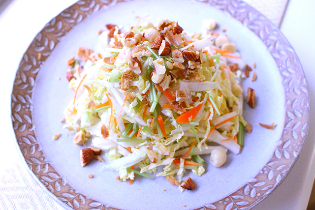 白菜とナッツのサラダにはオレンジワイン