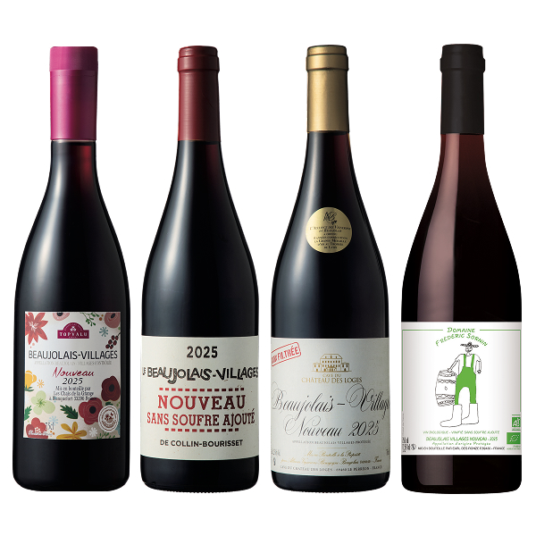 AEON de WINEが厳選した、ヴィラージュヌーヴォーを4本セットにしたお買い得セット。【商品名1】 2025 トップバリュ ボージョレ・ヴィラージュ・ヌーヴォー/ トップバリュ<説明>イチゴやラズベリーのような甘い赤果実の果実味が口いっぱいに広がります。深みがあり、まろやかな酸味とフルーティさのバランスが良いヌーヴォーです。<産地>フランス ブルゴーニュ ボジョレ・ヴィラージュ <ぶどう品種>ガメイ <特長>タイプ:赤 / 味わい:ミディアムボディ<容量>750【商品名2】【酸化防止剤無添加】2025 コラン・ブリセ ボージョレ・ヴィラージュ・ヌーヴォー<説明>ぶどうは厳選された木から収穫し、畑からほど近いワイナリーに運ばれ、小さなタンクで素早く発酵を開始するこだわりの逸品です。<産地>フランス ブルゴーニュ ボジョレ・ヴィラージュ <ぶどう品種>ガメイ <特長>タイプ:赤 / 味わい:ミディアムボディ<容量>750【商品名3】2025 カーヴ・デュ・シャトー・デ・ロージュ ボージョレ・ ヴィラージュ・ヌーヴォー ノンフィルター<説明>上品でシルキーなタンニンと豊かで瑞々しい果実味が調和したリッチで芳醇な味わいが広がります。<産地>フランス ブルゴーニュ ボジョレ・ヴィラージュ <ぶどう品種>ガメイ <特長>タイプ:赤 / 味わい:ミディアムボディ<容量>750【商品名4】【酸化防止剤無添加】2025 フレデリック・ソルナン ボージョレ・ヴイラージュ・ヌーヴォー / フレデリック・ソルナン<説明>マスターソムリエ高野豊が、優良で注目すべき品質のワインを選抜しました。こだわりと技術、土壌の特徴を最大限に表現することを目指し、酸化防止剤を加えずに丁寧に醸造しました。<産地>フランス ブルゴーニュ ボジョレ・ヴィラージュ <ぶどう品種>ガメイ <特長>タイプ:赤 / 味わい:ミディアムボディ<容量>750<受賞歴>トロフェ・リヨンボージョレ・ヌーボーコンクール2019金賞受賞画像がヴィンテージと異なる場合がございます。ご了承下さい。