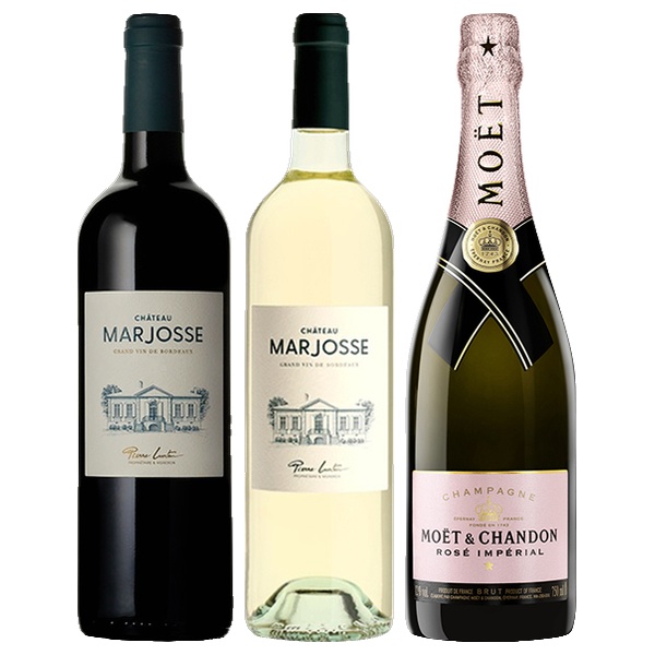 赤・白・ロゼを一度に楽しめる贅沢な三重奏ギフトセット。【商品名1】 シャトー・マルジョース 2021<説明>パーカーポイント87-89点。シュヴァル・ブランやディケムを統括する醸造家が手掛ける、ハイクオリティなプライベートワイン。<産地>フランス ボルドー その他ボルドー<ぶどう品種>メルロ カベルネ・フラン カベルネ・ソーヴィニヨン マルベック<特長>タイプ:赤 / 味わい:フルボディ<容量>750【商品名2】シャトー・マルジョース ブラン 2023<説明>シュヴァル・ブランやディケムを統括するボルドーで最も有能な醸造家が手掛ける、爽やかな香りと、上品な味わいのバランスが魅力の白ワイン。<産地>フランス ボルドー その他ボルドー<ぶどう品種>セミヨン ソーヴィニヨン・ブラン ソーヴィニヨン・グリ ミュスカデ<特長>タイプ:白 / 味わい:辛口<容量>750【商品名3】モエ・エ・シャンドン ロゼ・アンペリアル / モエ・エ・シャンドン <説明>世界で最も愛されているシャンパン、モエ・エ・シャンドンのロゼ。フルーティーで野イチゴのような香りが強く、新鮮でいきいきとした果実味がはっきり出ていて、喉ごしは柔らかです。<産地>フランス シャンパーニュ その他シャンパーニュ<ぶどう品種>ピノ・ノワール シャルドネ ピノ・ムニエ <特長>タイプ:ロゼ泡 / 味わい:辛口<容量>750画像がヴィンテージと異なる場合がございます。ご了承下さい。