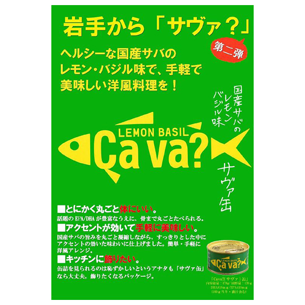 リピーター続出!!国産サバを原料にした洋風サバ缶シリーズ。原料・鮮度・加工方法にこだわった臭みのない味わいが特徴。「Ca va?(サヴァ)缶」は「東の食の会」と岩手県釜石市に工場をもつ「岩手缶詰(株)」と「岩手県産(株)」によって、東日本大震災で衰退した被災地三陸からオリジナルブランドの加工品を発信しようと、国産サバを使用したオリジナルの洋風缶詰として誕生しました。「Ca va?(サヴァ)?」はフランス語『元気ですか?』という意味。「元気ですか?」と岩手から全国へ向けて声をかけるイメージで名づけられました。内容量 170g 原産国 日本ワインとのマリアージ(おすすめワイン)は以下をチェック!!